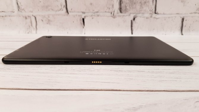 Корпус у T30 металлический, за исключением вставки под антенны в верхней части. Элементы между собой подогнаны хорошо, зазоры отсутствуют. При нагрузке на изгиб и скручивании можно услышать небольшое похрустывание, но при обычном использовании все хорошо. Также отмечу вес планшета — 560 грамм, который ощущается в играх, если планшет нужно держать на весу длительное время. Хлюпикам будет тяжело.